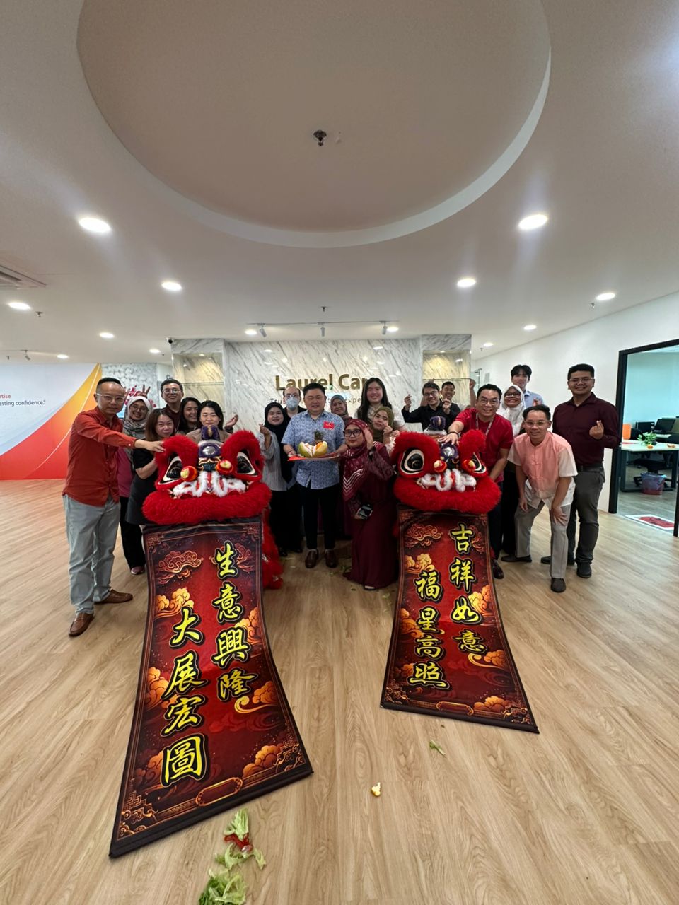 To the delight of staff, many of whom dressed up in traditional costumes, two red lions danced and ushered luck into the main office of Laurelcap.